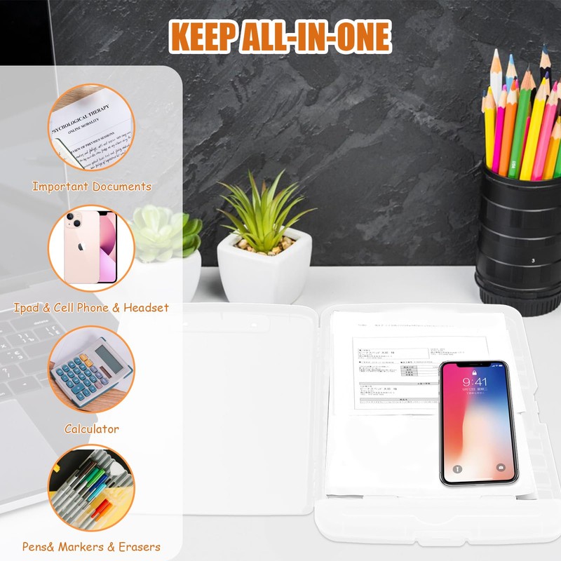 - HIGH CAPACITY: The clipboard has built-in storage space in the form of a paper storage box and a pen case, which can hold up to 200 letter-sized documents and 11 pencils. Perfect for storing files, iPads, calculators, power bank, pens, rulers, compasses, scissors, etc!