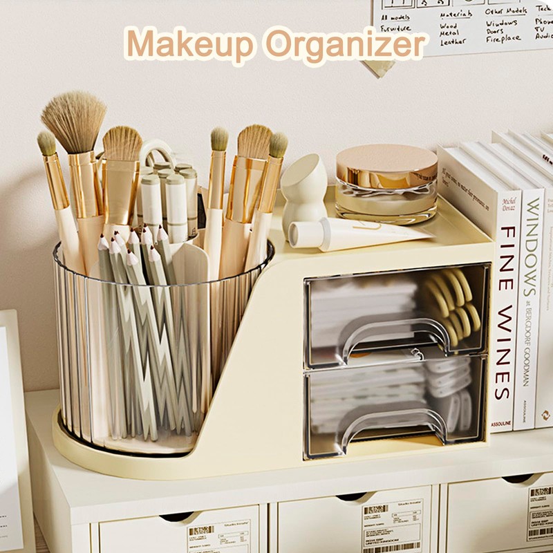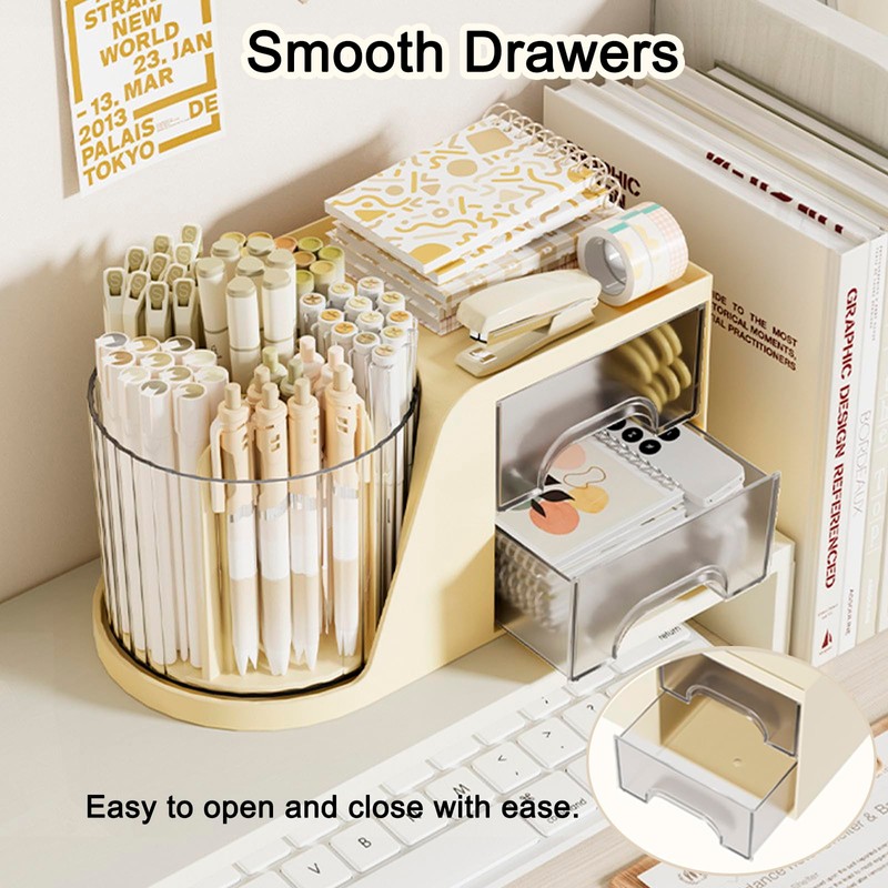 SAYEEC Rotating Desk Organizer with 2 Drawer, 6 Slots Multi-Functional Pencil Pen Holder, Desktop Makeup Organizer Stationery Accessories Storage Box Caddy for Office School Home Art Supplies (Beige)