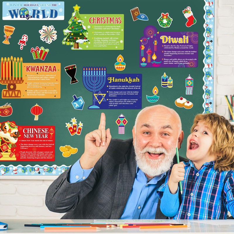 - Delicate Design: the winter bulletin board decoration is designed with typical winter festival styles such as Chinese New Year, Hanukkah, Diwali, Kwanzaa, and Christmas; Featuring a list of bulleted facts about each holiday as well as images to represent each celebration, this set makes a nice addition to your winter classroom decorations and educational resources