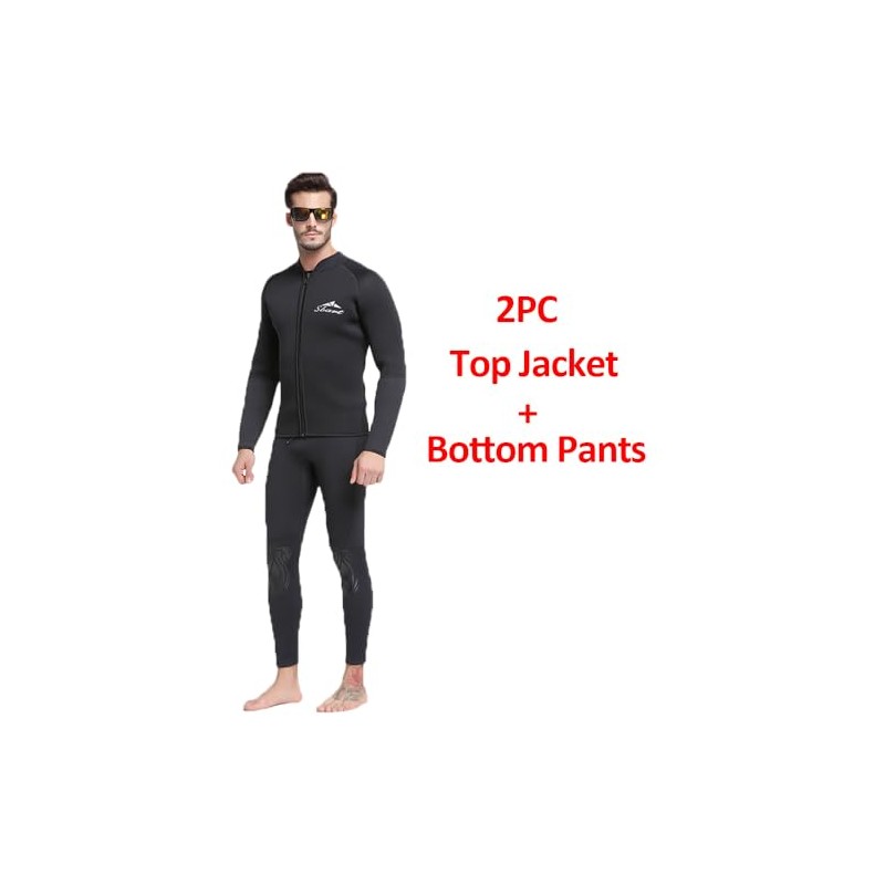 - Sbart high quality 3mm Neoprene full body wetsuit diving suit for men (2pc set). Two separate pieces include: 1 top jacket + 1 bottom pants, specially designed for various watersports and water aerobics, wetsuit durable front zipper provides UV protection and defense against sea lice, jellies and other biological irritants.