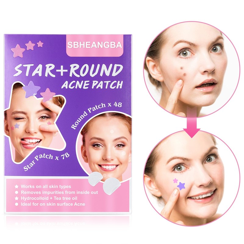 SBHEANGBA Pimple Patches for Face (126 Count), Acne Patches for Face, Star+Round Pimple Patch with Tea Tree Oil,Hydrocolloid Acne Patches Acne Patch Zit Patches for Face