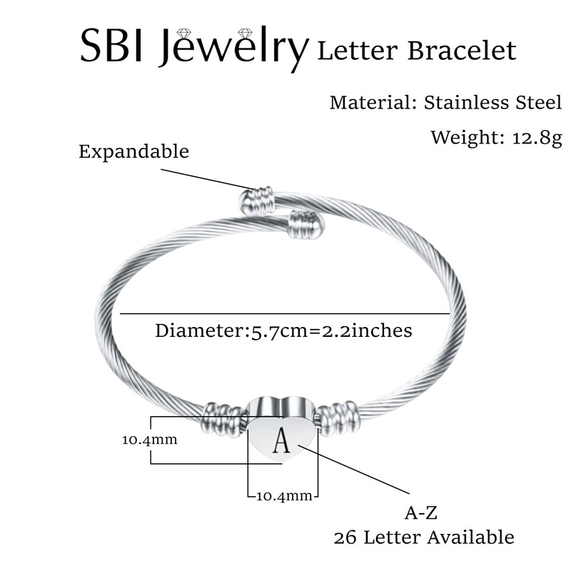 - Letter Bangle Bracelets is expandable, its diameter is 70mm/2.7", which could fit for 16-21cm wrist length (22cm would total fit on the wrist) ; Weight : 13 g. Initial Letter Wrap is made by stainless steel, a wonder metal of choice for body jewelry, allowing it to withstand the wear and tear of everyday activities.