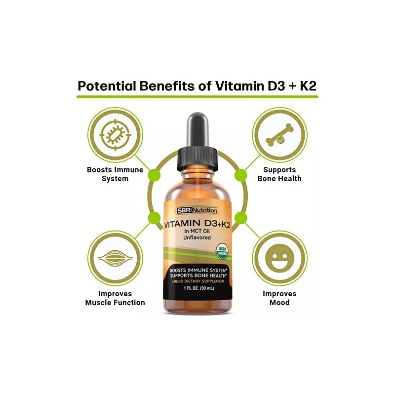 SBR Nutrition Vitamin D3+K2 (MK-7) Liquid Drops, MCT Oil, Immune, Bone, Heart, Unflavored