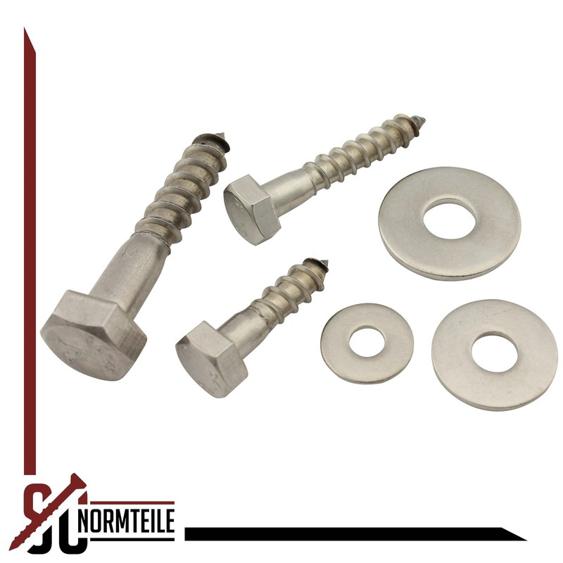 SC-Normteile hexagon wood screw according to DIN 571 and matching washer according to DIN 9021 made of A2 stainless steel.