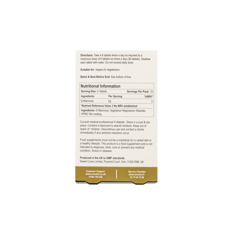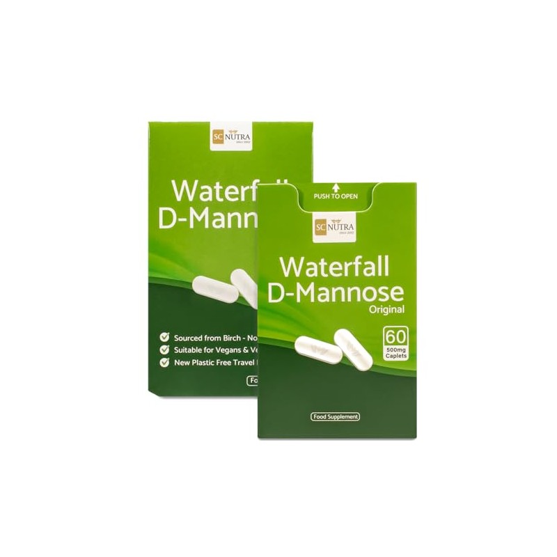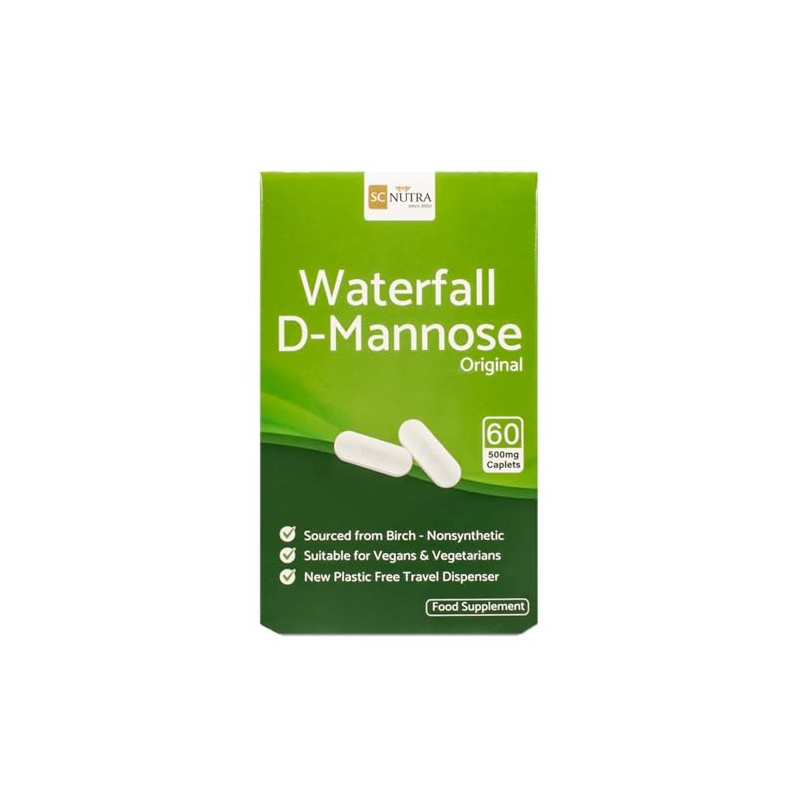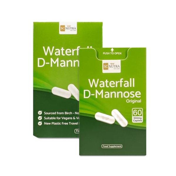 SC Nutra Waterfall D-Mannose Caplets (Easy Swallow Tablets) 60 x 500mg – New Plastic Free Handy Pack | SC Nutra (Sweet Cures),Green Box, White Tablets