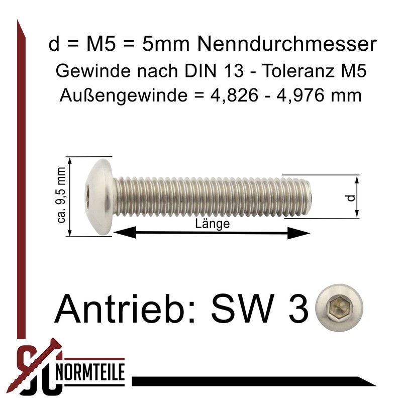 - ►Quantity:50pcs,Size:M5x12 (Diameter: 5mm, Length [Without Head]: 12mm), Thread Pitch: 0.8mm, Head Diameter: Approx. 9.5 mm, head height: approx. 2.75 mm, drive size (SW): 3 mm, type: round head screws with hexagon socket according to ISO 7380-1, metric standard thread (full thread - right-hand thread)