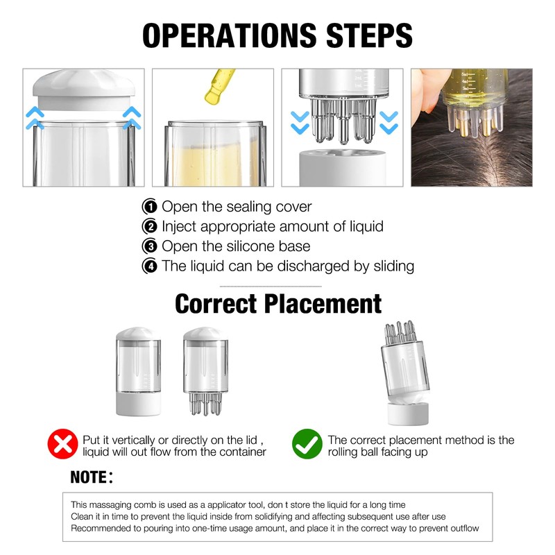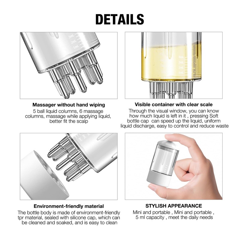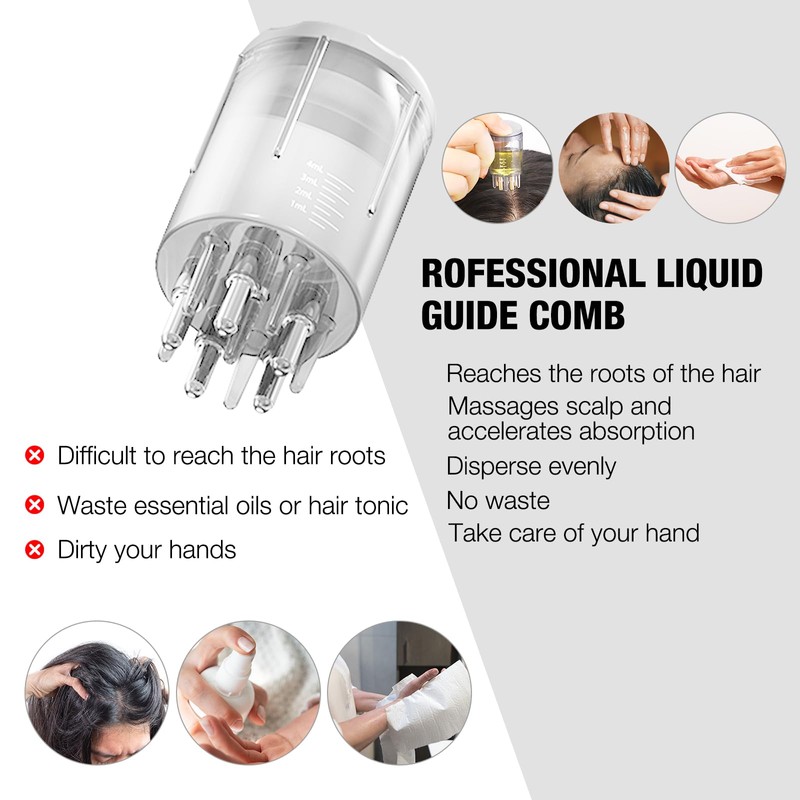 - Massage and liquid application at the same time: The professional liquid guide comb is easy to use. Without manual use, the essence liquid can be inserted precisely into the hair root, with 5 elastic rolling ball teeth and 6 auxiliary comb teeth, making it better fit the scalp. Rolling forward and back on the scalp and pressing on the soft cap can accelerate the flow of liquid.