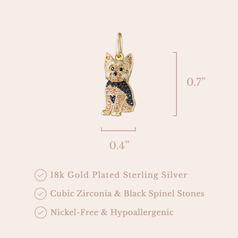 - Yorkie Elegance Captured - This .925 sterling silver charm, plated in radiant 18K gold, celebrates the Yorkshire Terrier's distinctive elegance and spirited personality. Adorned with cubic zirconia and genuine black spinel, it perfectly captures the essence of the Yorkie's luxurious coat and lively spirit