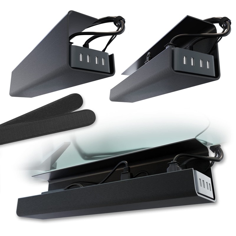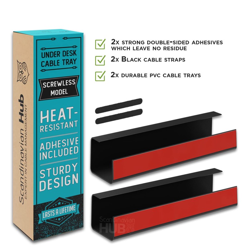 Scandinavian Hub No-Screw Under Desk Cable Management Tray - Self-Adhesive Installation, Cord Management, Cable Tray, Under Desk Wire Organizer - Black Set of 2