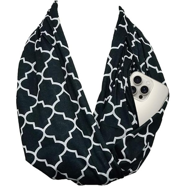 Scarves for Women, Ladies, Infinity Scarf with Zipper Pocket Pattern Print Lightweight Wrap (Black, 25 * 180CM)