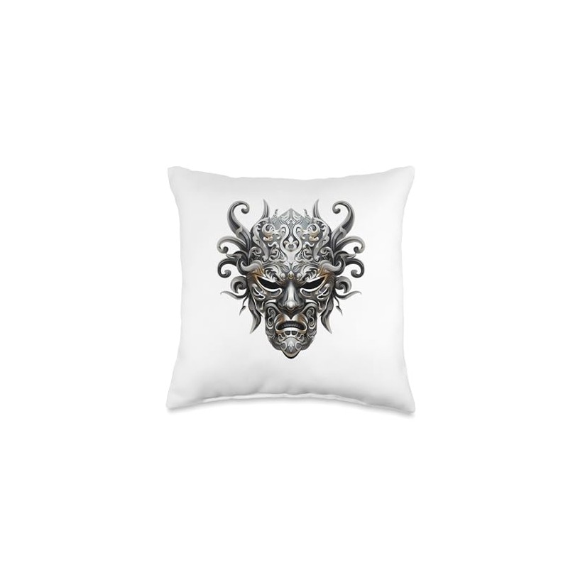 Scary Silver Yokai Oni Mask Japanese Anime Warrior Throw Pillow