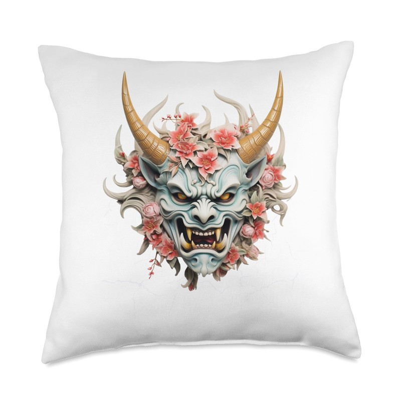 Scary Yokai Oni Mask With Red Flowers Japanese Anime Warrior Throw Pillow