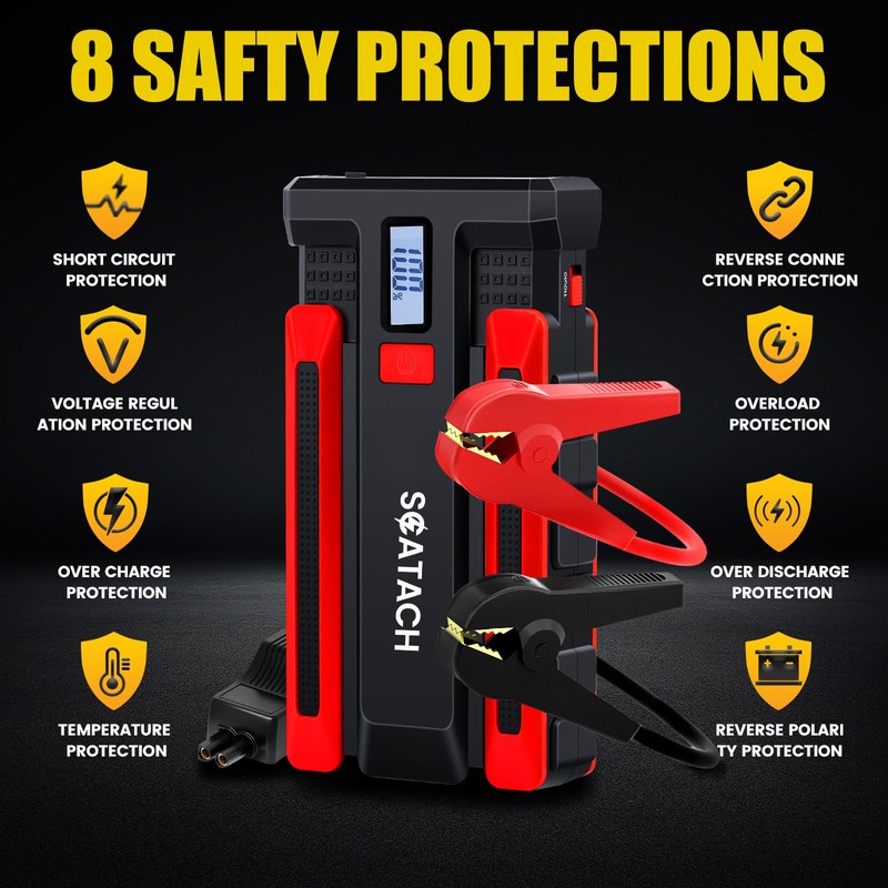 • Además de sus capacidades de arranque de salto, este arrancador portátil también cuenta con tres modos de iluminación de linterna: normal, estroboscópica y SOS, proporcionando iluminación de emergencia en diferentes escenarios. Las características de seguridad integradas de los cables de puente, incluyendo protección de polaridad inversa, protección contra sobrecorriente y protección contra cortocircuitos, garantizan una experiencia de arranque segura y sin complicaciones.