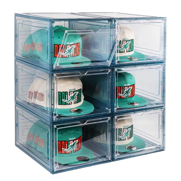 SCAVATA 6 Pack Hat Organizer Box, Stackable Clear Baseball Caps Holder Box Containers with Magnetic Door for Hats Snapback Cap Storag, Hat Rack Display Case, Holds 8 Hats Each (Blue)