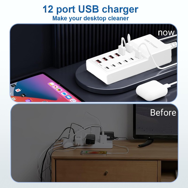 • Super compatibilityThe multi port USB desktop hub charges multiple devices at once, while the 12 port hub is compatible with USB C and USB A port devices, compatible with iPhone 16/15/14/14Plus/14 Pro/14 Pro Max/13/13 Mini/13 Pro/13 Pro Max/12/12 Mini/12 Pro/12 Pro Max/11/11 Pro/11 Pro Max/XR/XS/X/8/7, compatible with Galaxy S24/S23/S22/S21/S20/S10/S9/S8/Tablets/LG/Xiaomi/Google Pixel/MP3/MP4 players/Gaming devices/GPS devices and other digital devices.