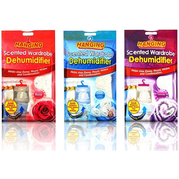 - Set Of 2 Scented Hanging Wardrobe Dehumidifiers Helps prevent Damp Mould Condensation Mildew. Specially designed to remove moisture from wardrobe. Choice of 3 scents. Quick and easy to use. The special crystals draw moisture from the surrounding atmosphere traps it inside the dehumidifier. 210g per dehumidifier. PLEASE NOTE THAT PRODUCT IS NOT REUSABLE ONE FULL.