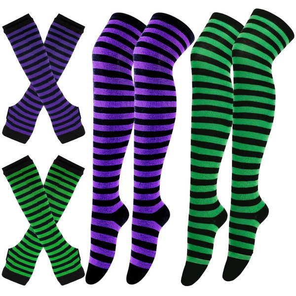- [Package Contents]: You will receive 1 pair of black and purple striped socks, 1 pair of black and green striped socks, 1 pair of black and purple striped arm warmers, 1 pair of black and green striped arm warmers. They can add personality to your daily wear and keep you warm on cold days.