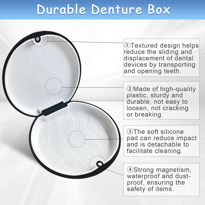The denture case made of environmentally friendly food grade flavor purification materials can ensure that the material is non-toxic and odorless, protecting your oral health and hygiene. Denture pots with lids with magnetic attraction have sufficient sealing, no water leakage, and are very sturdy and durable