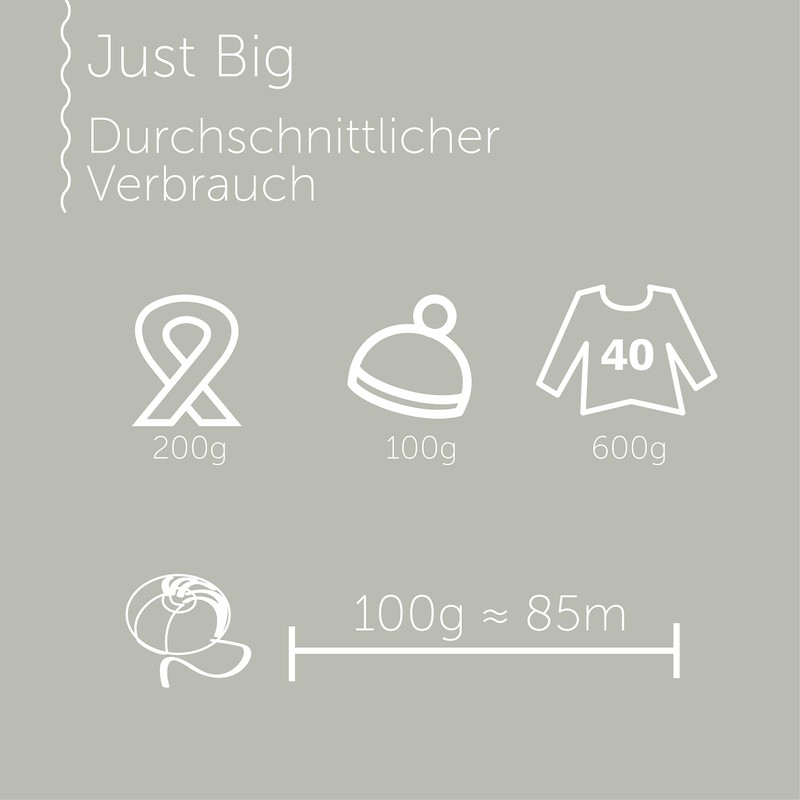 - Box contents: 1x Schachenmayr Just Big, design: 100 g, length: 85 m, needle size: 12-15 mm, tension sample (10 x 10 cm): 7.5 m x 11 R