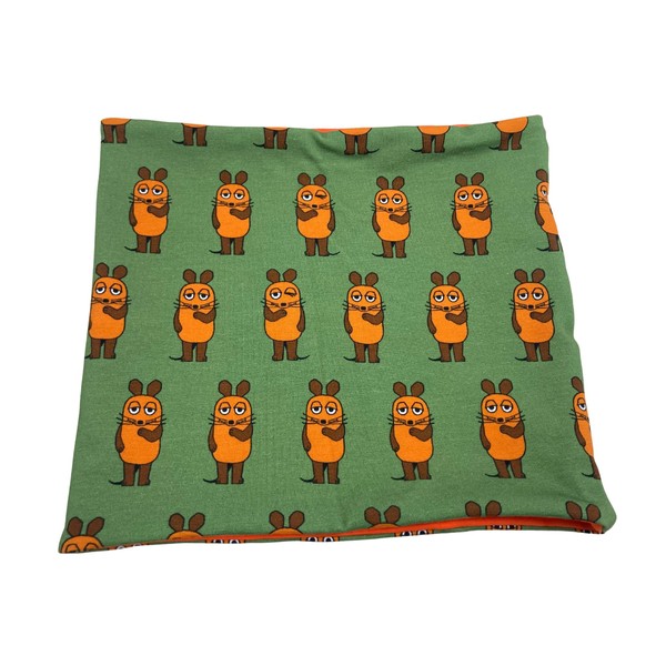 Schal aus Baumwolljersey mit der Maus auf grün, verschiedene Formen: Loop oder Halssocke, ggfs gefüttert mit Baumwollfleece (Innenmaterial Baumwolljersey, Loop)
