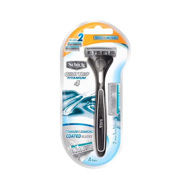 Schick Quattro Titanium 4 is a durable razor featuring 4 Titanium and Diamond coated blades that stay sharp to reduce irritation. An additional edging blade provides extra precision in hard-to-reach spaces, and an ergonomically designed handle gives added control. Plus, the great price makes it easy on your wallet.