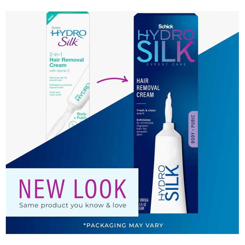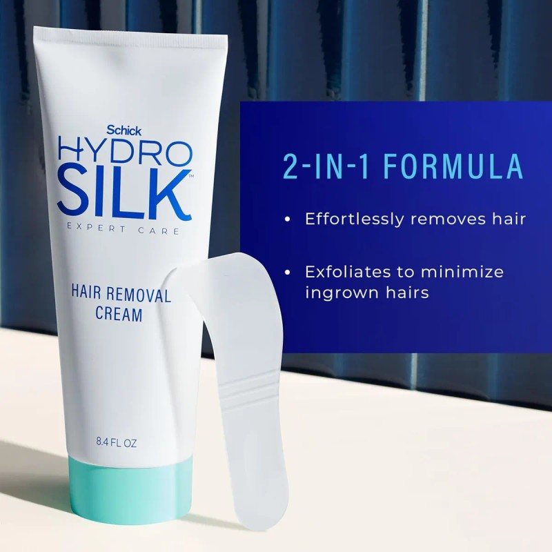 Fórmula 2 en 1: la crema depilatoria Schick Hydro Silk elimina sin esfuerzo el vello y exfolia para minimizar el vello encarnado para una piel suave, por lo que es ideal para tu área púbica y cuerpo.; Aroma fresco y limpio: lujosa crema depilatoria sin olor desagradable.; Probado por dermatólogos: crema de depilación púbica que es suave para la piel sensible y perfecta para usar en tu cuerpo y zona del bikini.; Sin dolor y fácil de usar: fácil aplicación y extracción, dejando una piel suave y sedada sin cortes ni muelas.; Fabricado con cuidado: vegano y formulado con vitamina E y 85% de ingredientes de origen natural*. * Los ingredientes de origen natural contienen >50% de materiales de fuentes naturales.; Incluye: 8.4 onzas. crema depilatoria corporal y 1 espátula. Revelar una piel suave nunca ha sido tan fácil, gracias a la crema depilatoria Schick Hydro Silk. Obtén atención de nivel experto en casa con esta lujosa crema depilatoria para mujeres que elimina sin esfuerzo el vello no deseado mientras exfolia para una piel suave. Nuestra crema de depilación corporal probada por dermatólogos ayuda a minimizar los pelos encarnados y es segura para la piel sensible. La piel suave y sedada está a solo una toallita con nuestra crema depilatoria que es segura para usar en piernas, brazos, axilas y como una crema depilatoria de bikini para el área púbica. Disfruta del aroma fresco y limpio de esta crema depilatoria vegana para el cuerpo que está formulada con fórmula de 85% de origen natural* y vitamina E. *Los ingredientes de origen natural contienen > 50% de materiales de fuentes naturales.