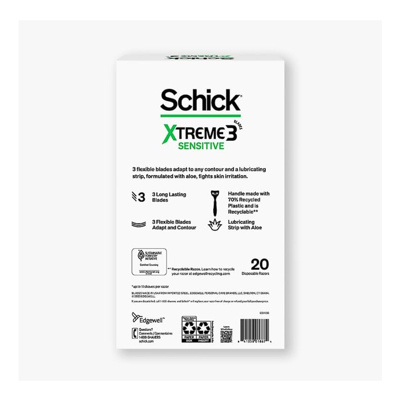 • Long-lasting blades: get up to 11 shaves with each Schick Xtreme3 Sensitive Razor for a total of up to 220 shaves per pack