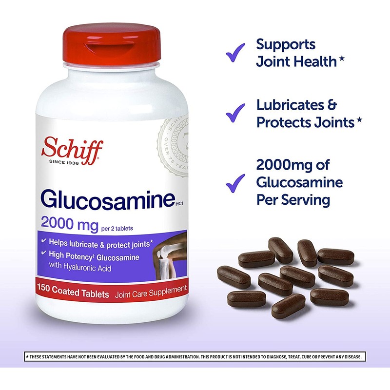 Schiff Glucosamine 2000mg with Hyaluronic Acid (Pack of 4) - Schiff Glucosamine helps lubricate and protect joints by helping you maintain healthy structure and function of cartilage in your joints. It contains Glucosamine Hydrochloride (HCl) which has a high potency of active Glucosamine. Glucosamine HCl is about 83% Glucosamine while some brands use Glucosamine Sulfate which is only about 65% Glucosamine. The recommended serving size is 2 softgels daily. Guaranteed for purity, freshness, and labeled potency. These statements have not been evaluated by the food and drug administration. This product is not intended to diagnose, treat, cure or prevent any disease. CONTAINS SOY AND SHELLFISH (SHRIMP, CRAB, LOBSTER, AND CRAYFISH). Recommended Use: Adults take two (2) tablets daily with a meal OR one (1) tablet twice daily with meals.