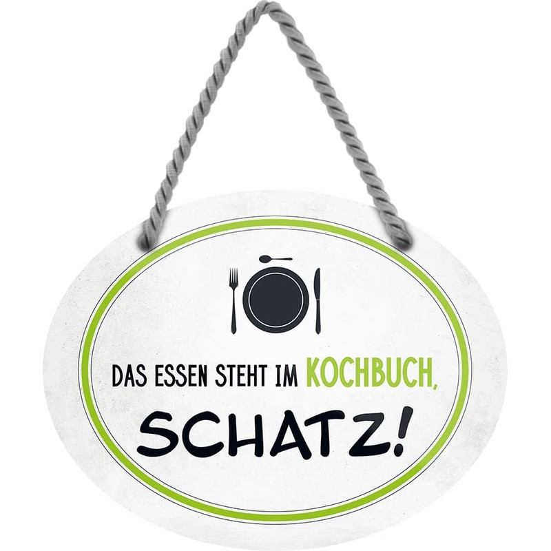 • Funny saying: with the funny saying "Das Essen steht im Kochbuch Schatz!" The sign shows in a humorous way who is saying in the kitchen.