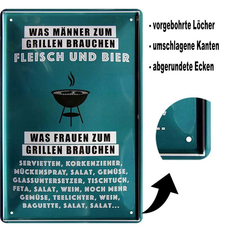 - Funny grill saying: "What men need for grilling - meat and beer". The beautiful lettering makes this sign an absolute eye-catcher and will enhance your barbecue corner, garden, balcony, terrace or kitchen Especially all grill masters who like to fry or cook will be happy with this item! :)
