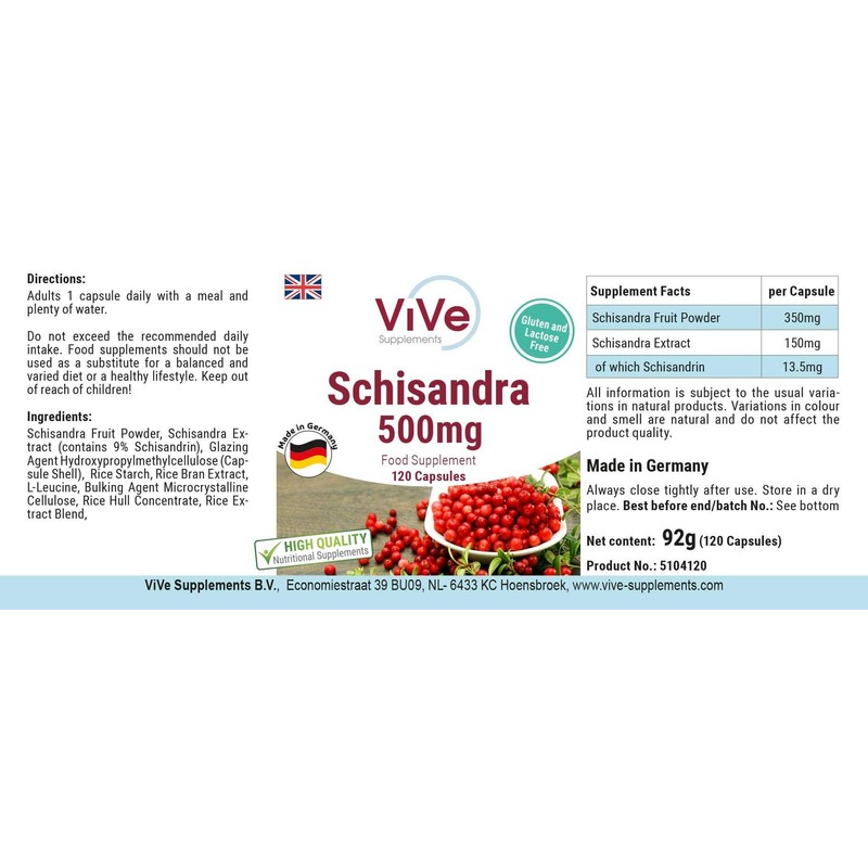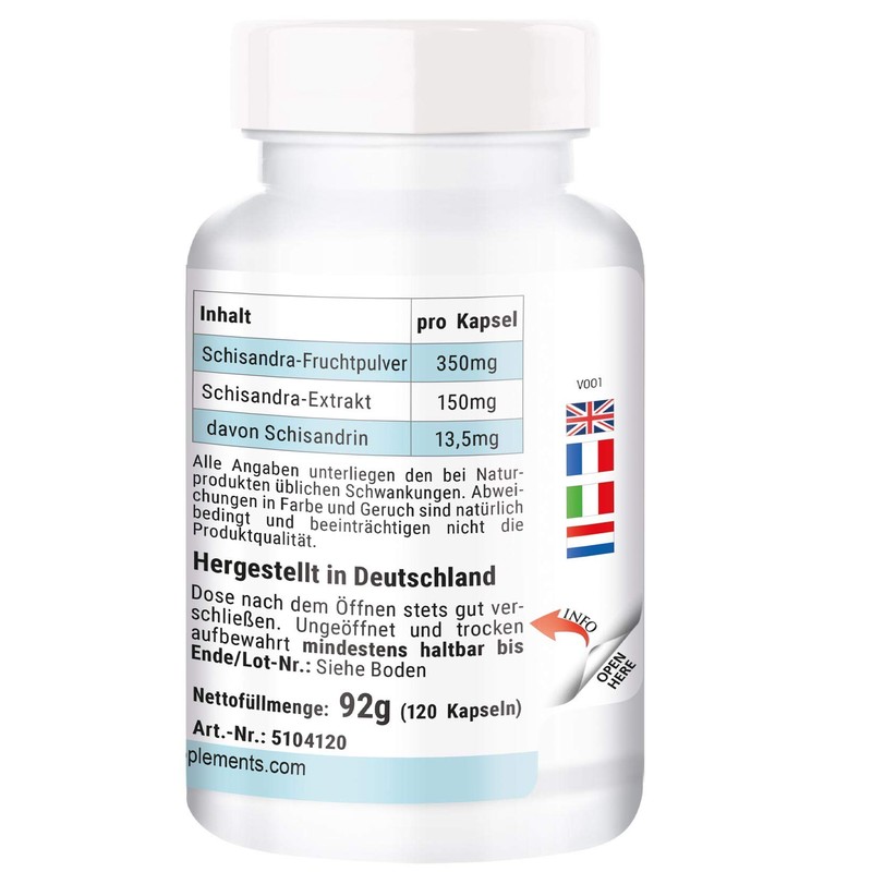 - Excellent value for money: 120 high-dose Schisandra capsules. One capsule contains: Schisandra fruit powder 350 mg Schisandra extract 150 mg of which schisandrin 13.5 mg - daily recommendation: 1 capsule with a meal with plenty of water.