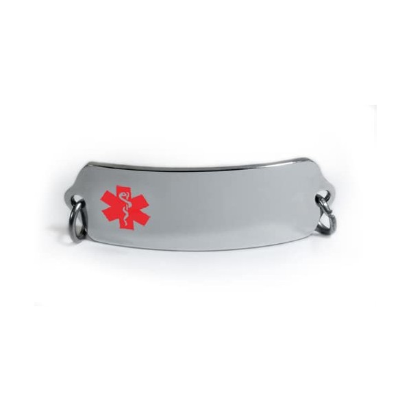 The Medical Id Tag features a RED medical logo embossed on the left side of the plate to allow engraving of medical condition on the front. The Tag tag is slightly curved for wrist wear.