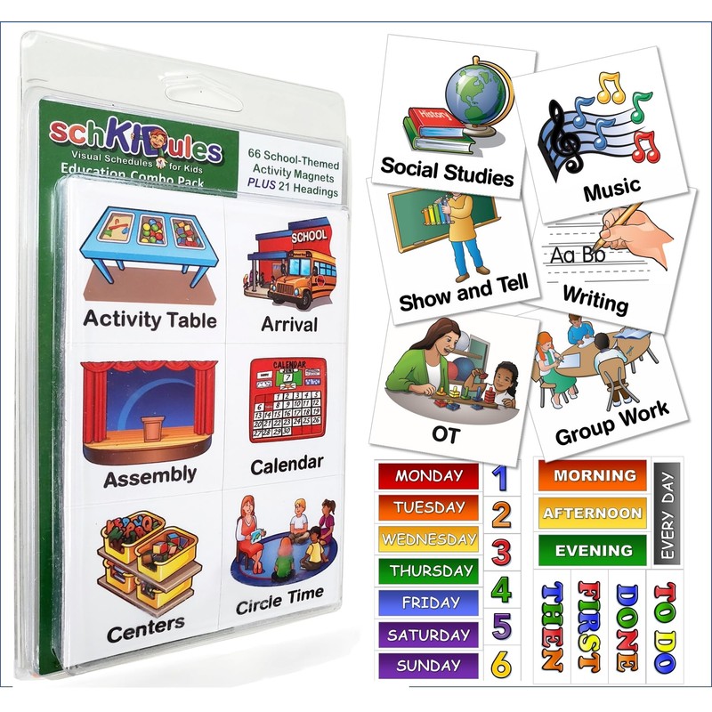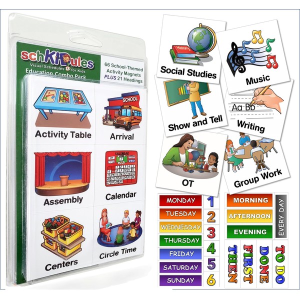 - INSTANT VISUAL SCHEDULE: Use the 66 education themed activity icons in combination with the 21 headings on any magnetic surface for multiple school day schedule options