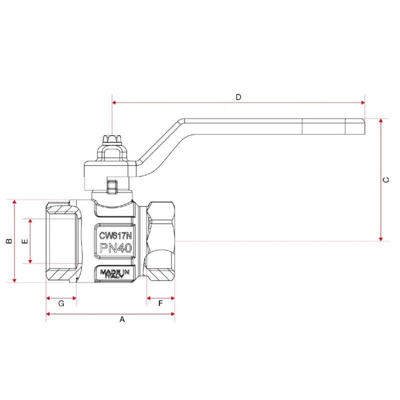 Ideal type full flow ball valve. Suitable for use in plumbing, heating, air conditioning and pneumatic systems. Bi-directional valves control flow in both directions. For their installation, the usual plumbing practices must be applied, especially: a) Make sure the two pipes are aligned correctly; b) Attach the wrench to the end of the valve closest to the pipe during assembly. To prevent the screw locking layer from breaking and the valve thus losing its sleeve coupling, it is important not to expose the two parts to torque. The use of mounting material (PTFE, hemp) must be limited to the thread area as an excess could engage in the sealing area of the sealing ball and affect the seal. If the fluid contains impurities (dirt, dust, too high water hardness), these must be removed or filtered. Product 100% made in Italy