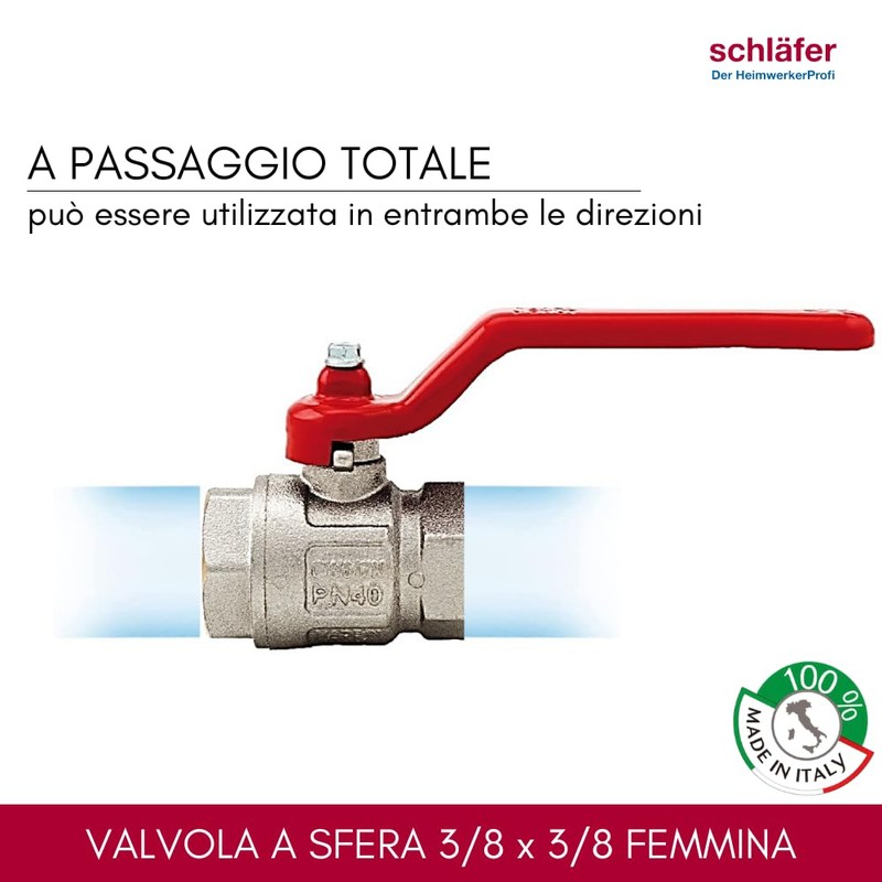 Schläfer 0933131 | 3/8 Female Brass Thread with Red Lever Handle for Water and Oil, Ideal Full Flow Valve and DN10 Universal Female Thread. Made in Italy