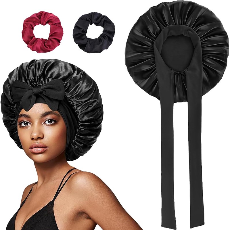 - [Stretchy Hair Loop]Um die Satin-Haarkappe besser zu nutzen, geben wir Ihnen 2 Haarschleifen als Geschenk. Sie können die weichen Haarbänder verwenden, um Ihr unordentliches Haar zusammenzubinden, bevor Sie die Schlafmütze verwenden.