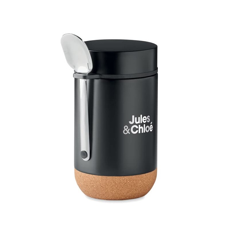 Double-walled stainless steel storage container with screw top and cork base. Includes spoon Capacity: 400 ml.