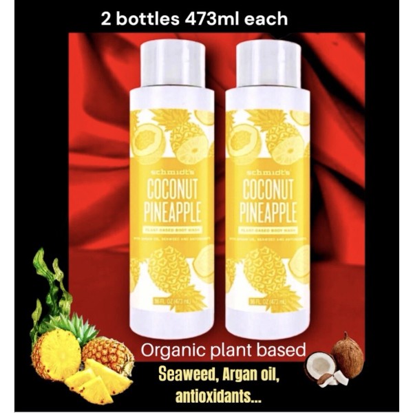 You will receive; 2 bottles 473ml each of: Schmidt’s Coconut Pineapple Plant Based Body Wash with Argan Oil, Antioxidants and seaweed
