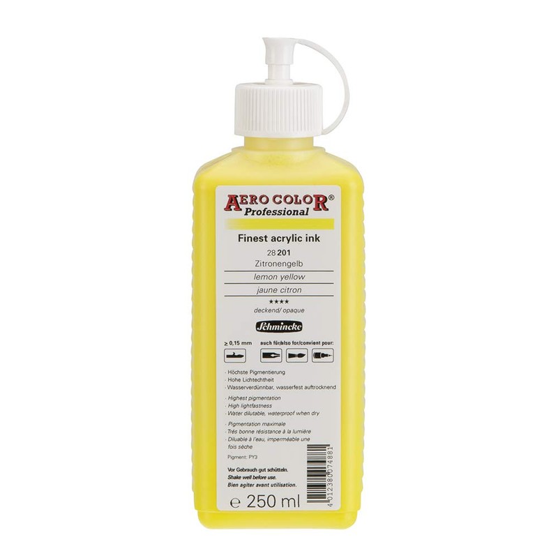- 🎨 AERO COLOR Professional: Lemon yellow in the 250 ml bottle, brilliant, opaque, ultra-fine acrylic ink for acrylic painting, airbrush, mixed media. Highly lightfast and intense, perfect for mixing many other colors.