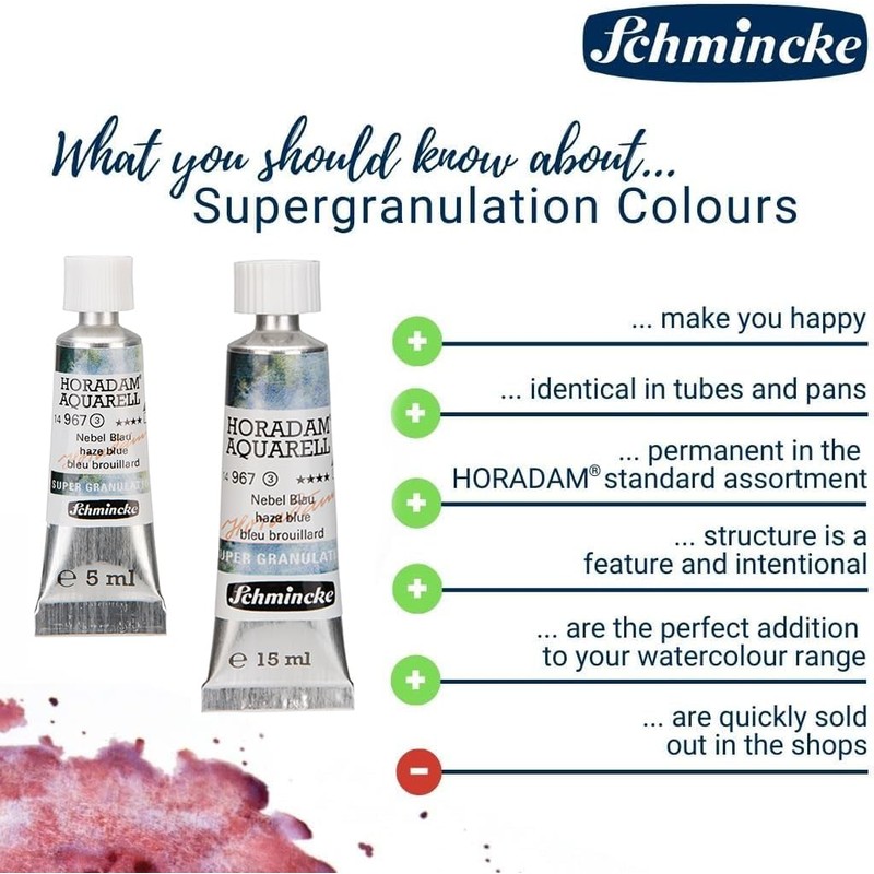 - Super granulating watercolour paint: the colour with very strong granulating effect thanks to the combination of at least 2 granulating Horadam pigments ensures special colour shading and natural structure, especially on rough paper. Colour selection ideal for fog and cloud representations and much more.