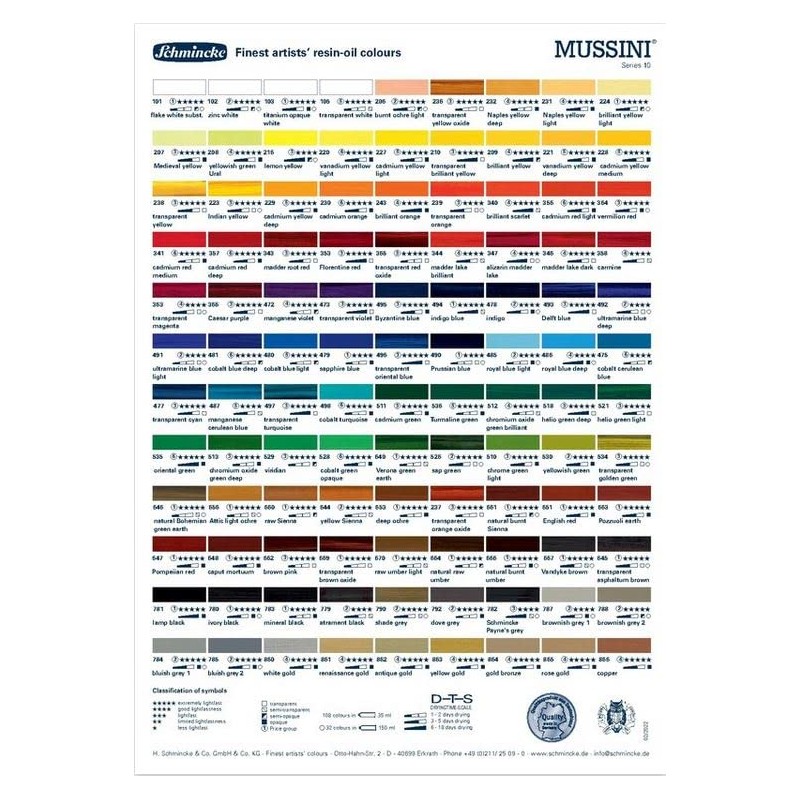 - Quality: MUSSINI, the founding product of Schmincke from 1881, meets the highest quality standards as the world's only finest resin oil paint. The 108 colours of the range are of the highest brilliance and intensity. The range contains a large number of pigment colours, elegant transparent colours and unique special colours. The balanced drying process results from the combination of the finest painting oils and resins, and the delicate resinous smell is very pleasant.