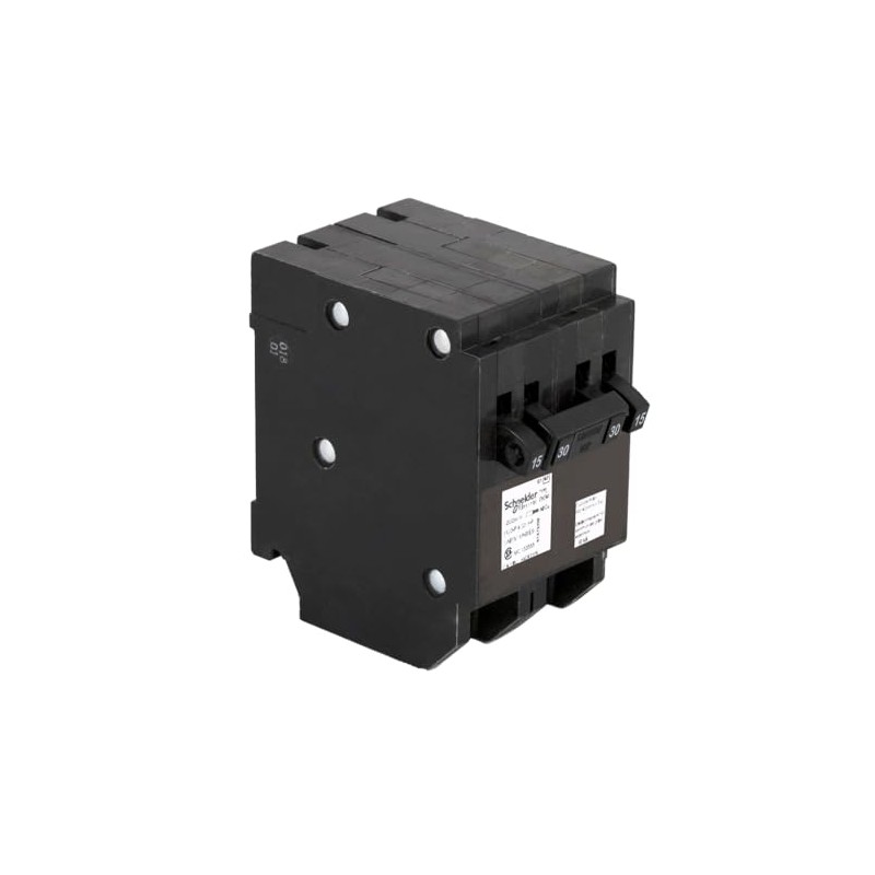 Schneider Electric - Homeline Quad Tandem Circuit Breaker, 2 x 1 Pole at 15A, 1 x 2 Pole at 30A, 120/240VAC, 10kA AIR, Plug-in, UL, HACR Rated Breaker Application, Screw Clamp Electrical Connection