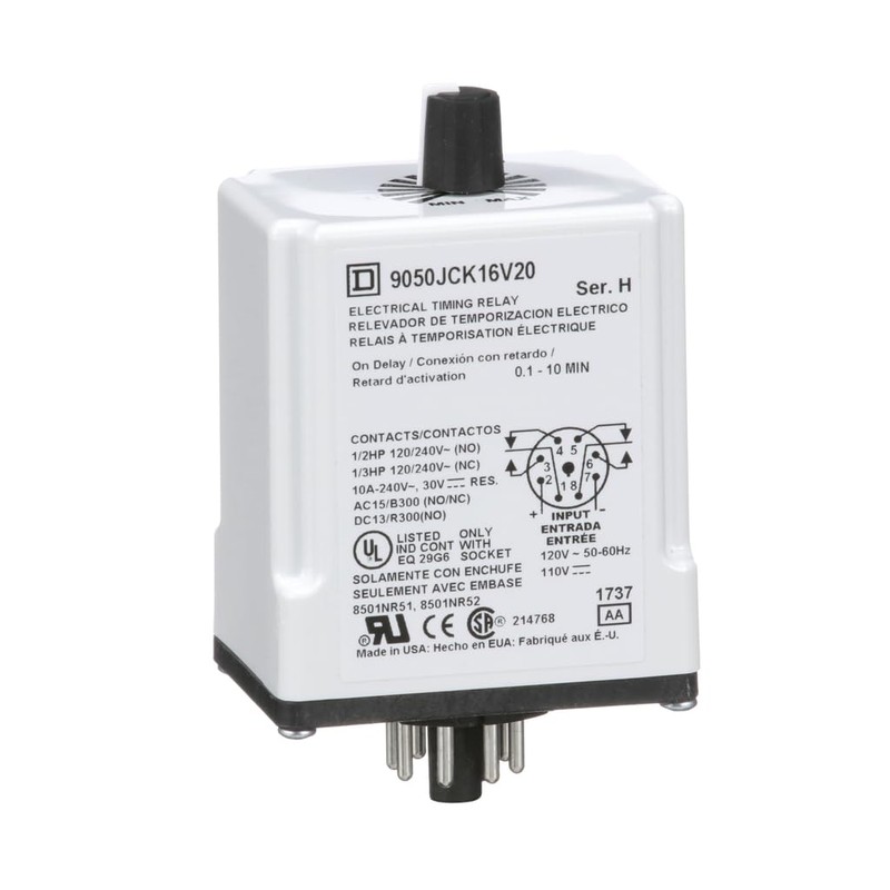 Schneider Electric Square D Harmony Timer Relay, 9050 JCK, On Delay, Adjustable Time, 0.1 to 10 Minutes, 10A, 240V AC, 120V AC/110V DC