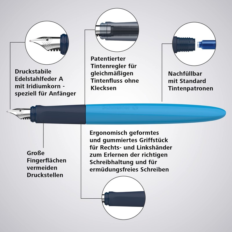- Federleichtes Schreibgefühl mit druckstabiler Edelstahlfeder A mit Iridiumkorn - perfekt für den Start mit dem Füller in der Grundschule