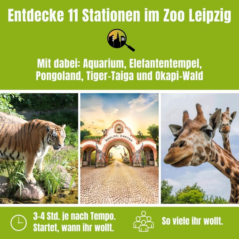 - Spannende Schnitzeljagd: Das Stadtspiel Zoo Leipzig eignet sich perfekt für Familien und Zoo-Liebhaber. Altersempfehlung: 6 bis 99 Jahre. Besichtige jede Station so lange du möchtest, auch Pausen sind jederzeit möglich.
