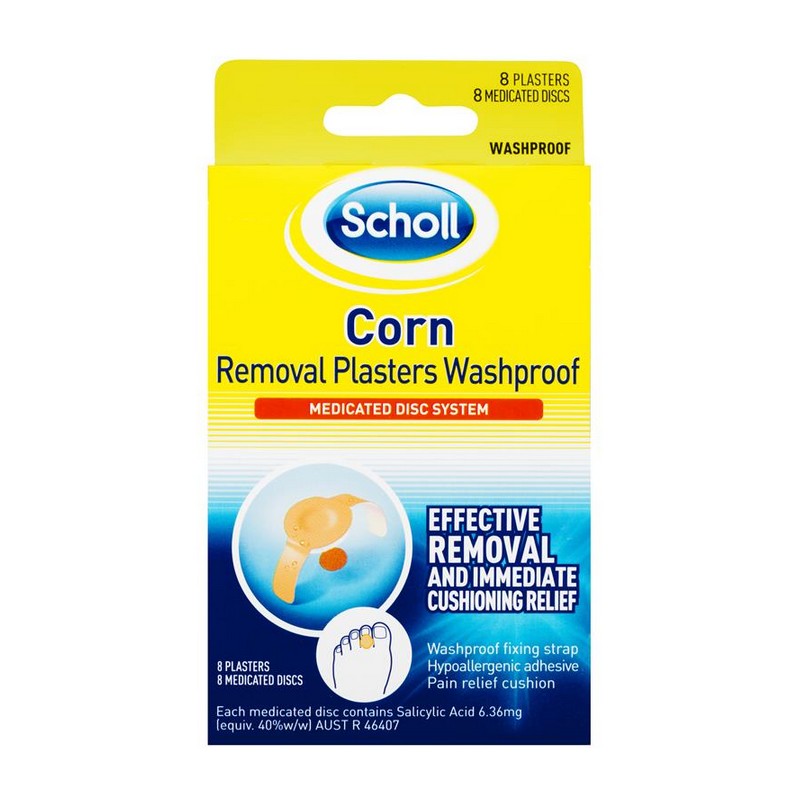 Scholl Corn Removal Plasters Washproof are especially developed for use on hard corns. Contains fast acting medicated discs which ensure that only the specific problem area is treated, without affecting the surrounding skin.