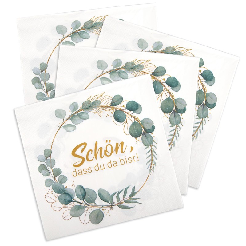 - Exclusive design: our birthday napkins are printed with a eucalyptus leaf wreath and the text "Schön Dass Du Da Bist". Beautiful patterns give the party an atmospheric touch