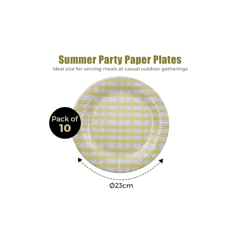 schone Summer Party Paper Plates – 10 Pack 23cm Gingham Print Disposable Plates – Assorted Colours – Outdoor Dining & BBQ Tableware (Yellow)