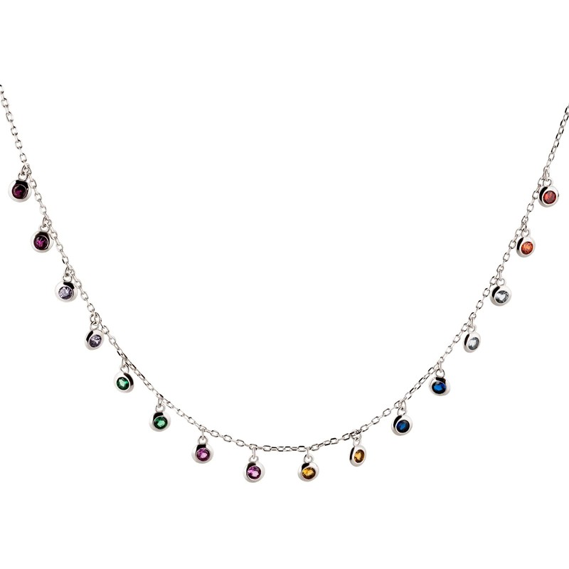 With great attention to detail design necklace with colourful stones. The 16 small zirconia crystals hang in approx. 1 cm distance on the fine anchor chain links of the filigree necklace. The small stones are each set in polished silver, so that the necklace shines beautifully. The jewellery is lightweight and very comfortable to wear and brightens up particularly plain outfits in the multi-coloured design.