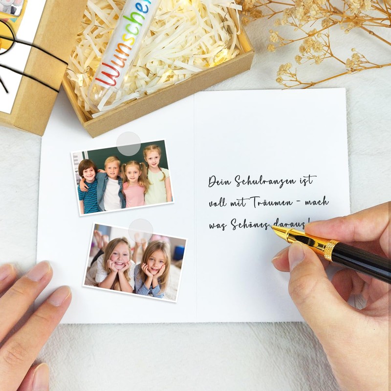 - The school gift set contains 1 x wish filler paper (11 x 6 cm), 1 x test tube, 1 x communion card (13 x 10 cm), 1 m fairy lights, 7 x white wood fish, 10 g raffia grass, 1 x ribbon and 1 x gift box.